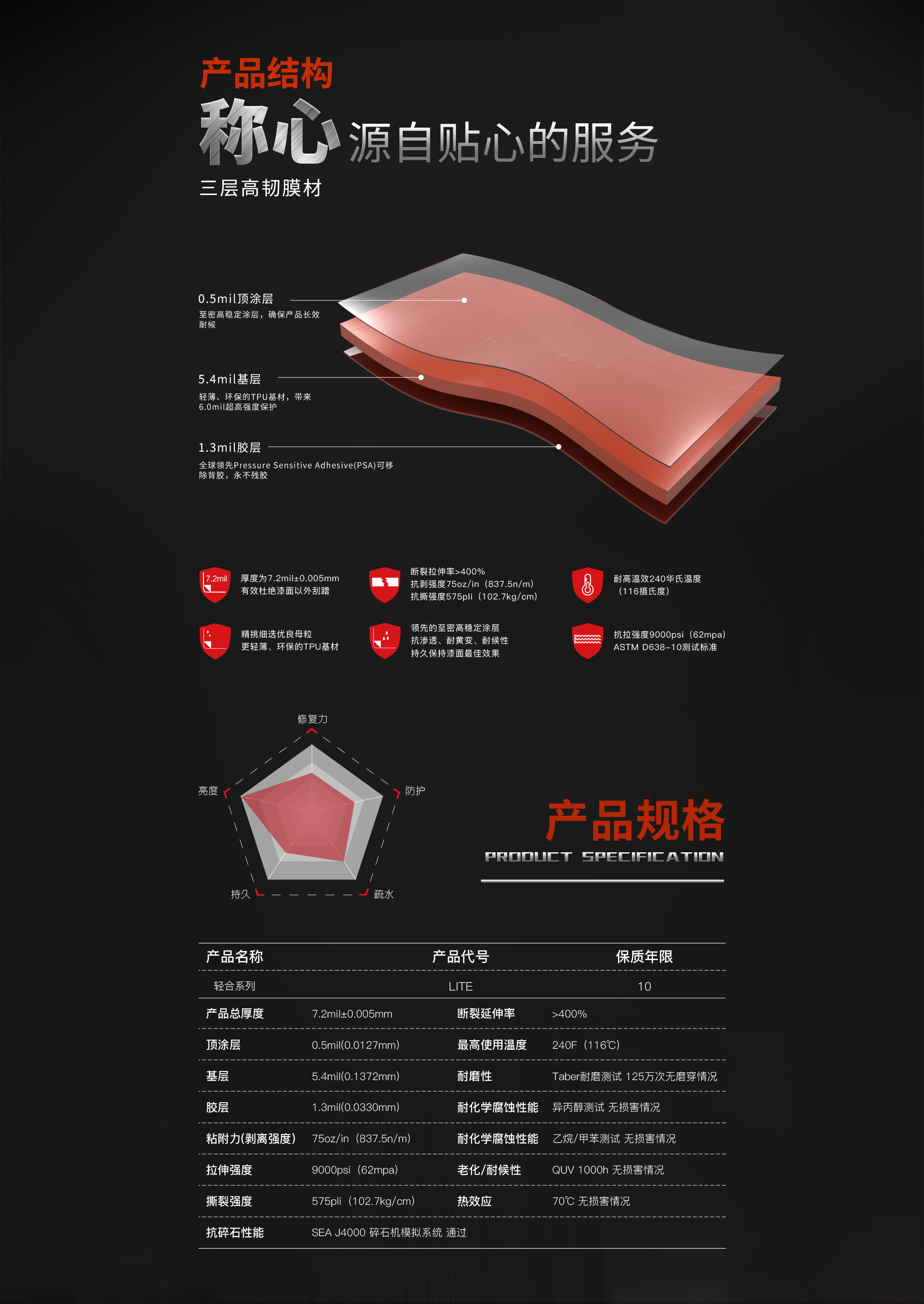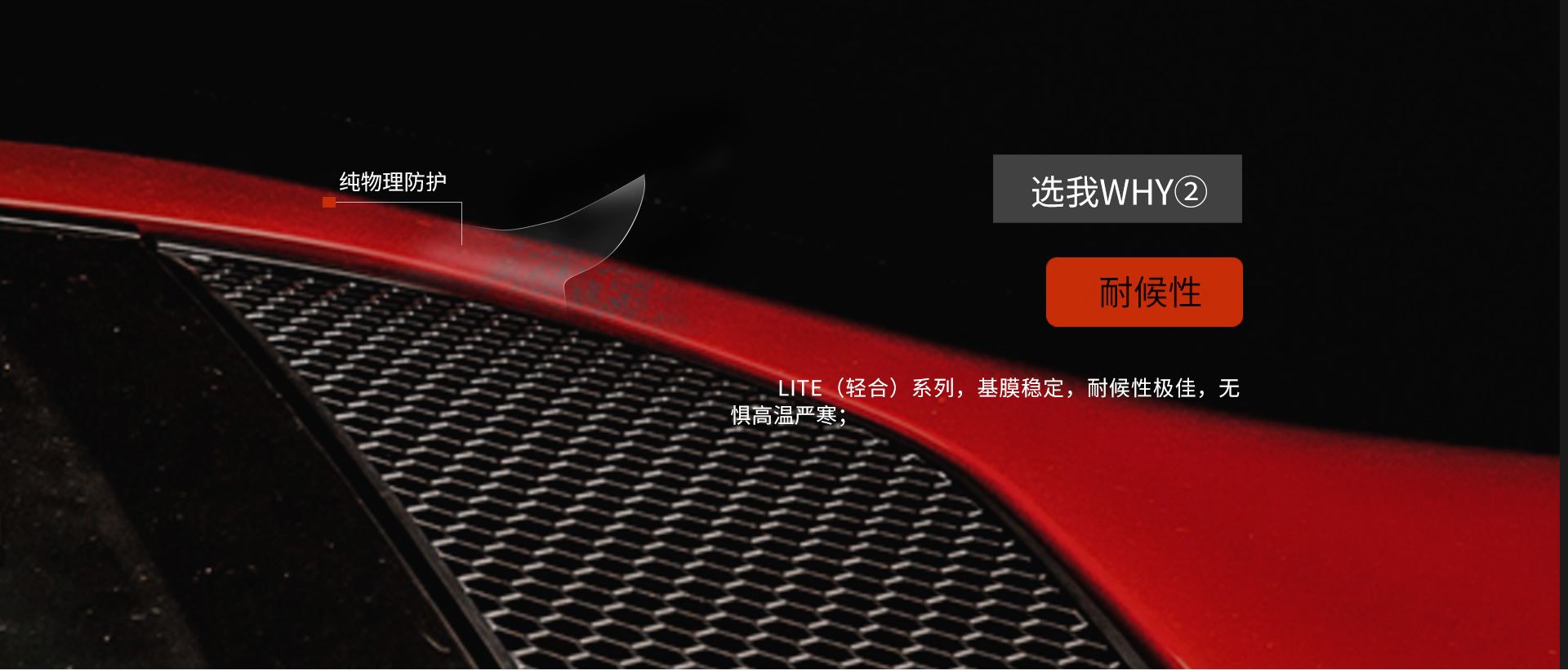 6.5-10miL高厚度,防剐蹭损伤漆面,高速公路上迎风面遭受的碎石冲击。